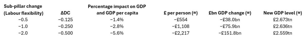 Today’s new calculation uses the Growth Commission’s Anti-Competitive Market Distortions Model to quantify the likely impact of the legislation. The model scores each country for labour market distortions and measures an impact on GDP based on that score as follows: